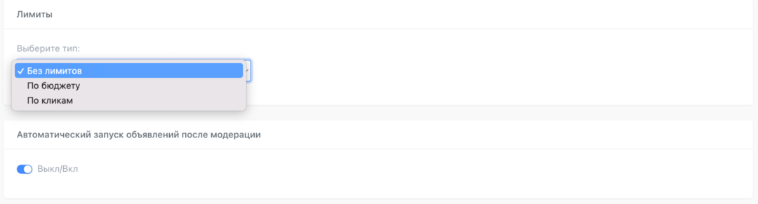 Выбери будет ли твоя кампания ограничиваться по бюджету, кликам или будет откручиваться без лимитов. Если уверен в своих настройках, можешь сразу ставить галочку “Запуск объявлений после модерации”, тогда не придется сидеть караулить аппрува, кампания запуститься самостоятельно.