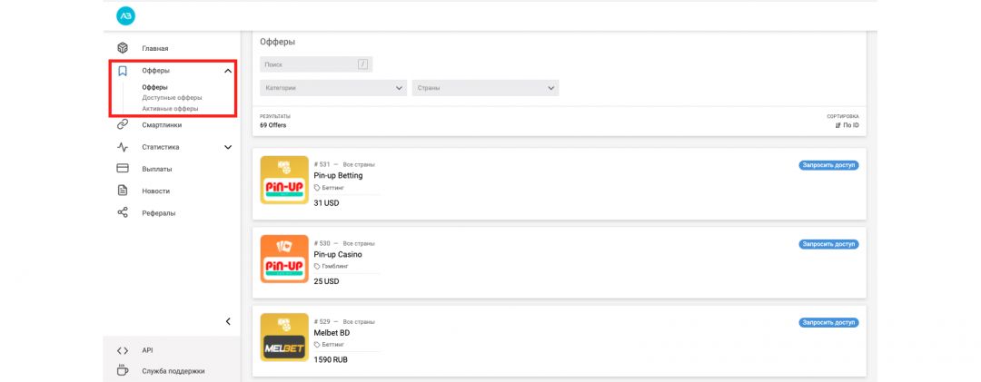 Для знакомства с предложениями партнерской сети перейди в раздел “Офферы”. Их можно отсортировать по категориям или ГЕО.